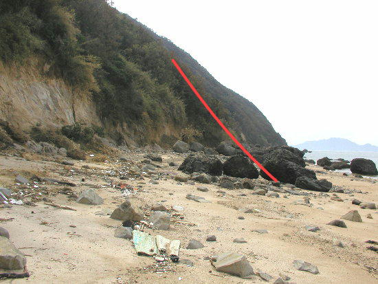 道の切れた辺りのドンビ石の辺り、私が子供の頃は山肌が赤い線の岩がある辺りにありました
