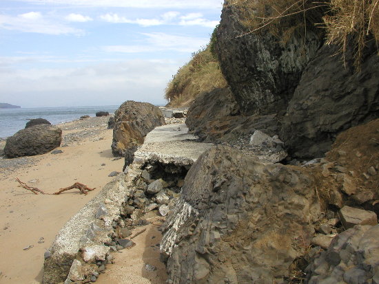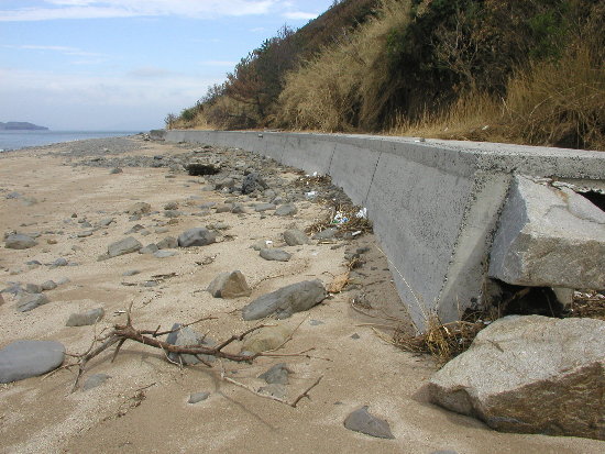 西の重ね岩の近くに新しく作られた部分があるが、ここは無傷でした。基礎から堤防まで一体構造になっており、頑丈に出来ているようだ。